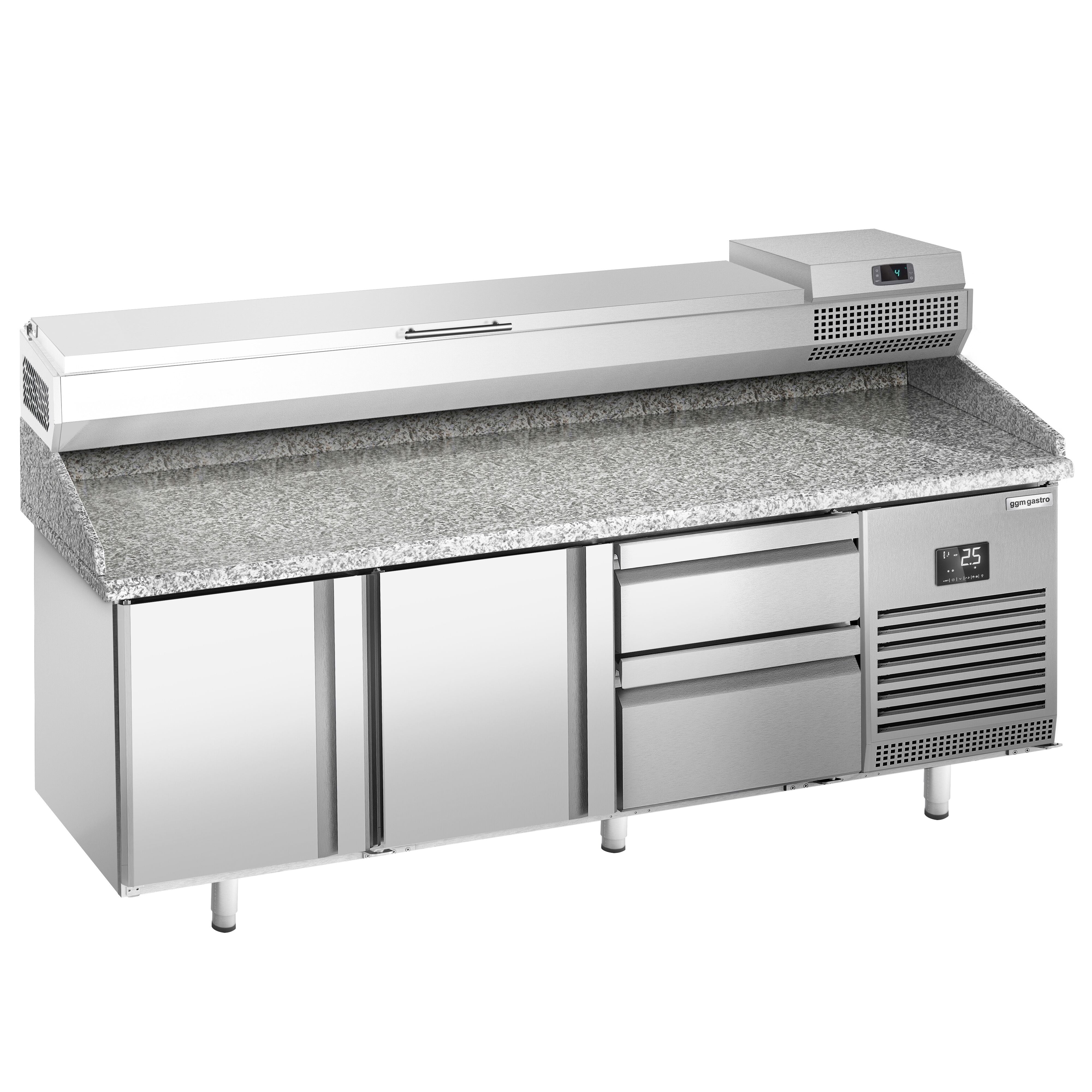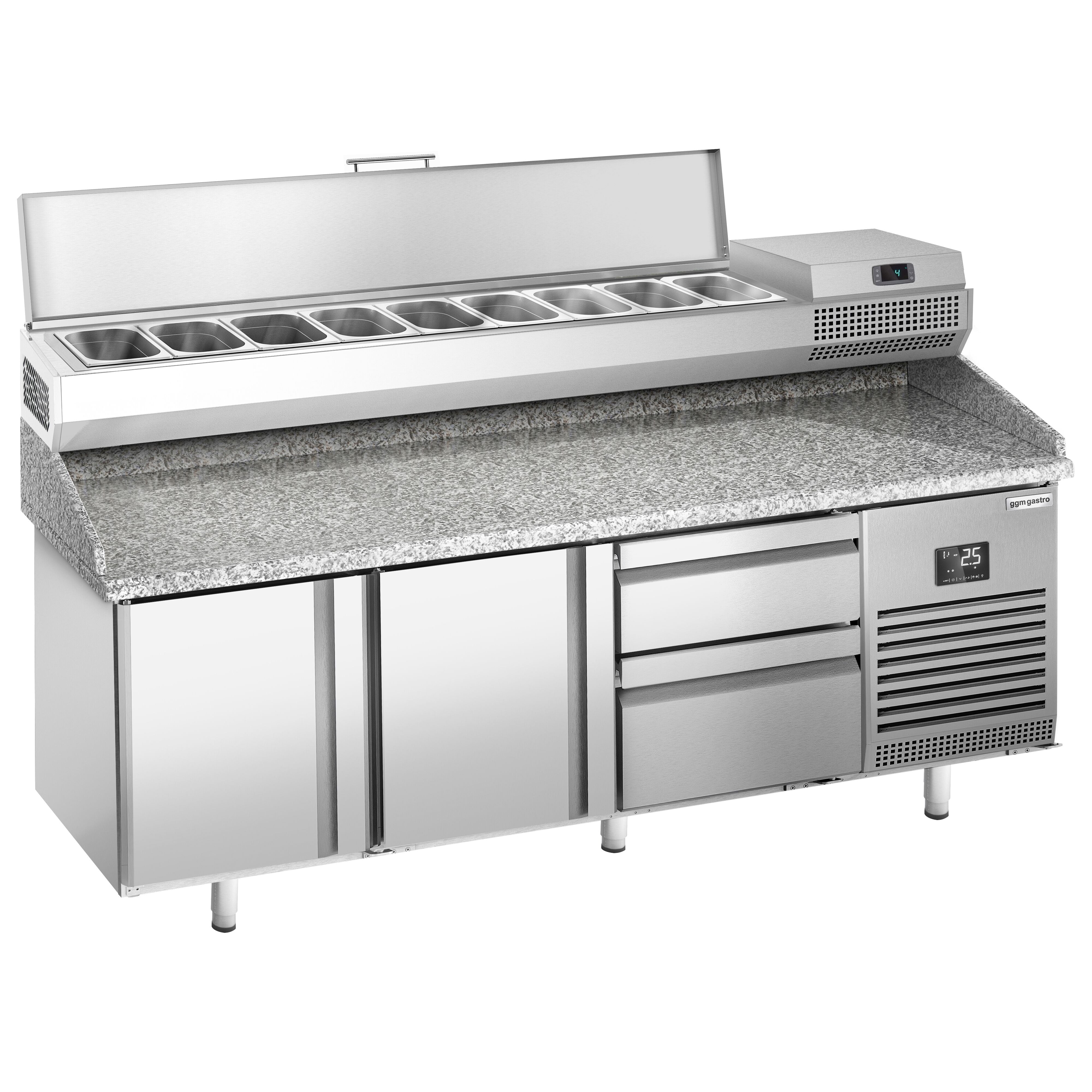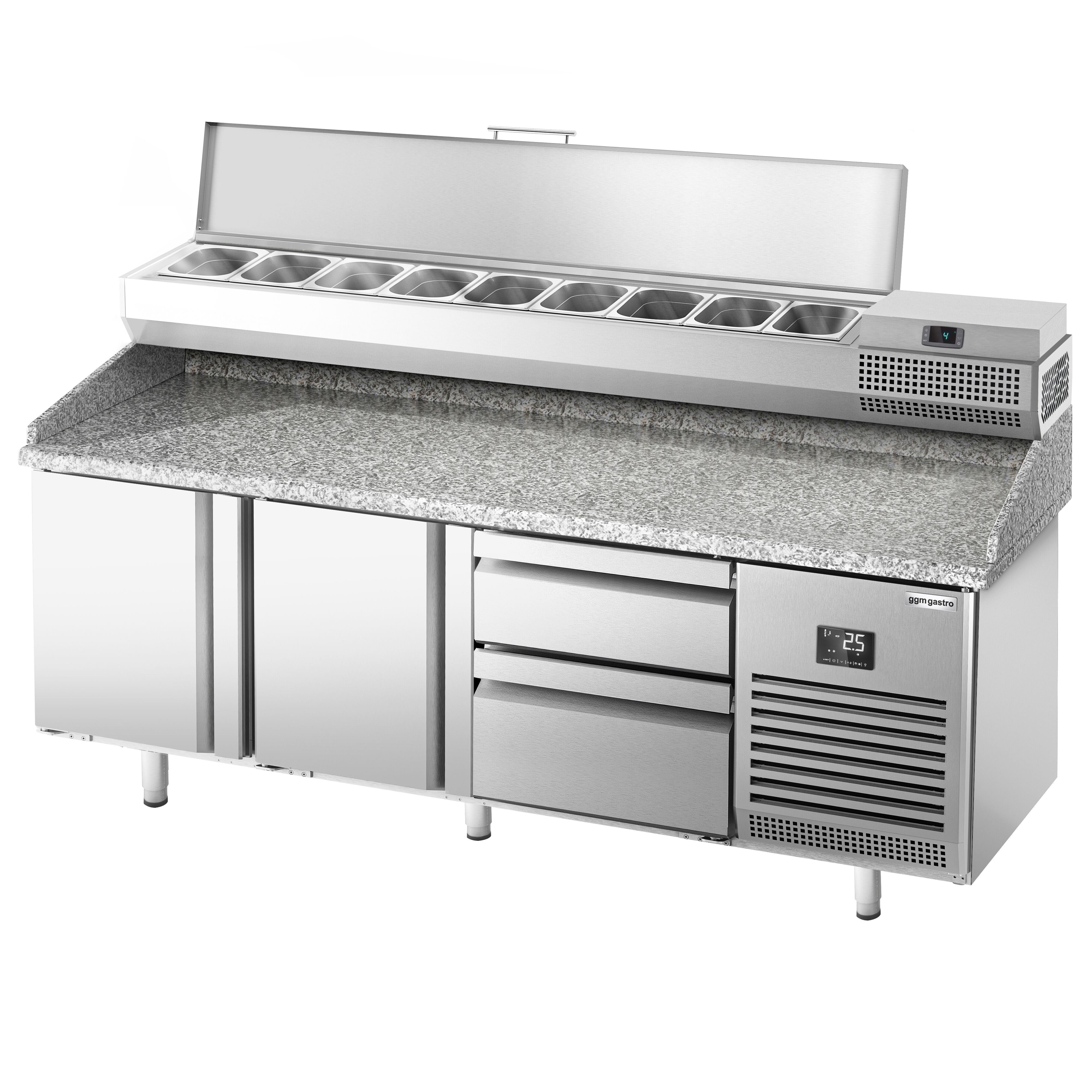 Охладителна маса за пица (GN) - с 2 врати, 2 чекмеджета 1x 2/3 и 1x 1/3 (GN 1/1) и охлаждаща горна витрина за 9x GN 1/4 контейнера