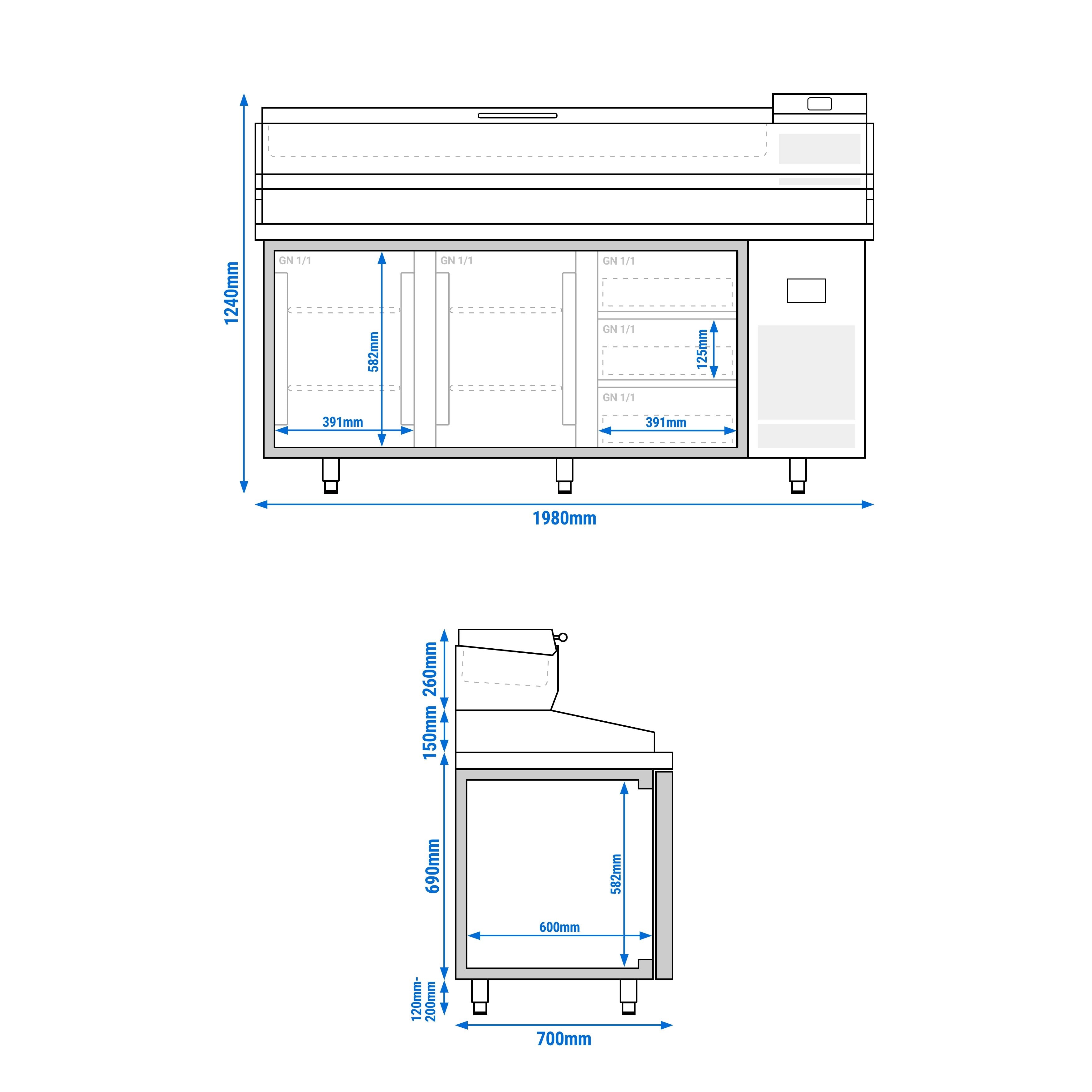 - Витрина, монтирана отгоре: например 10 x GN 1/4 Контейнер, GN 1/2, GN 1/3 също е възможно