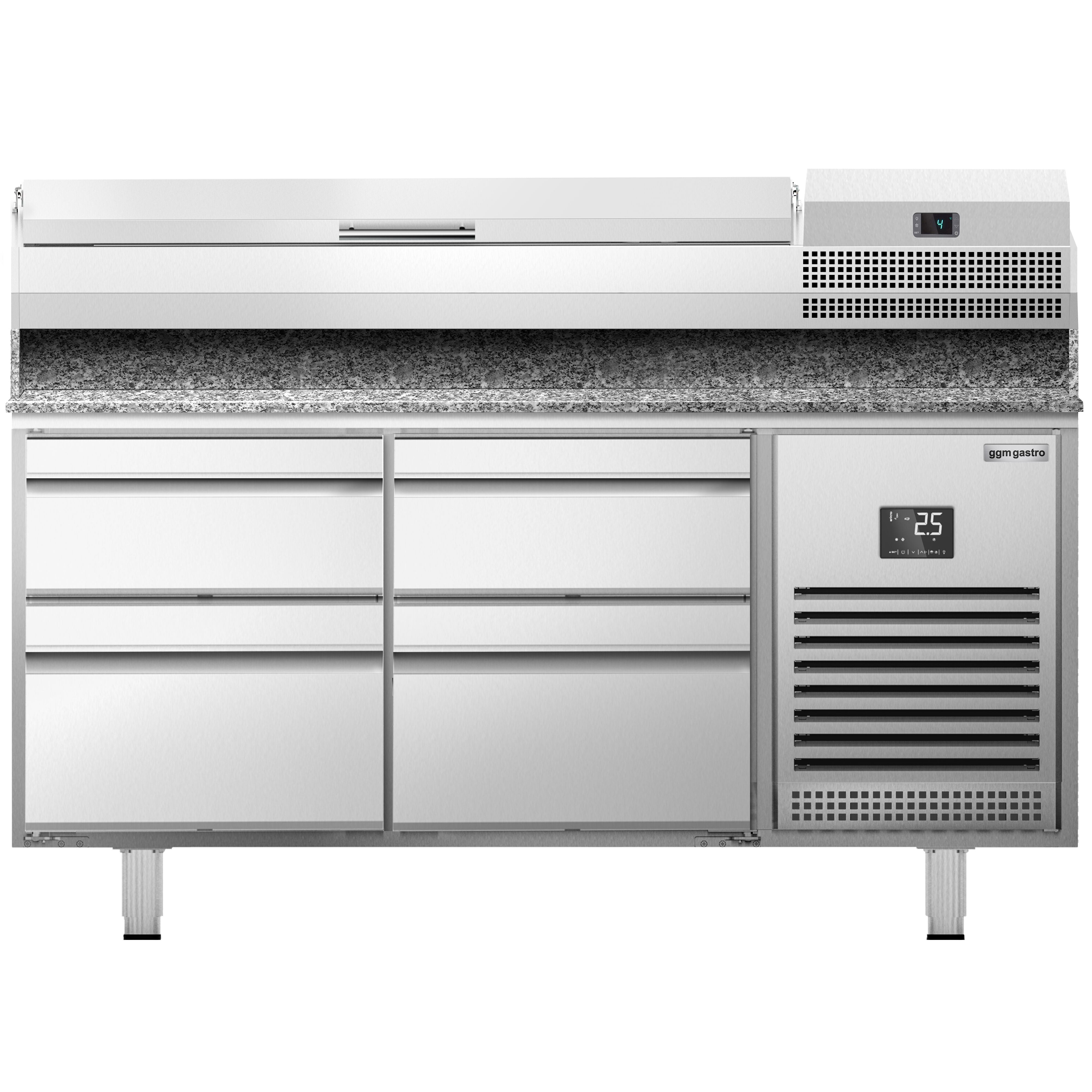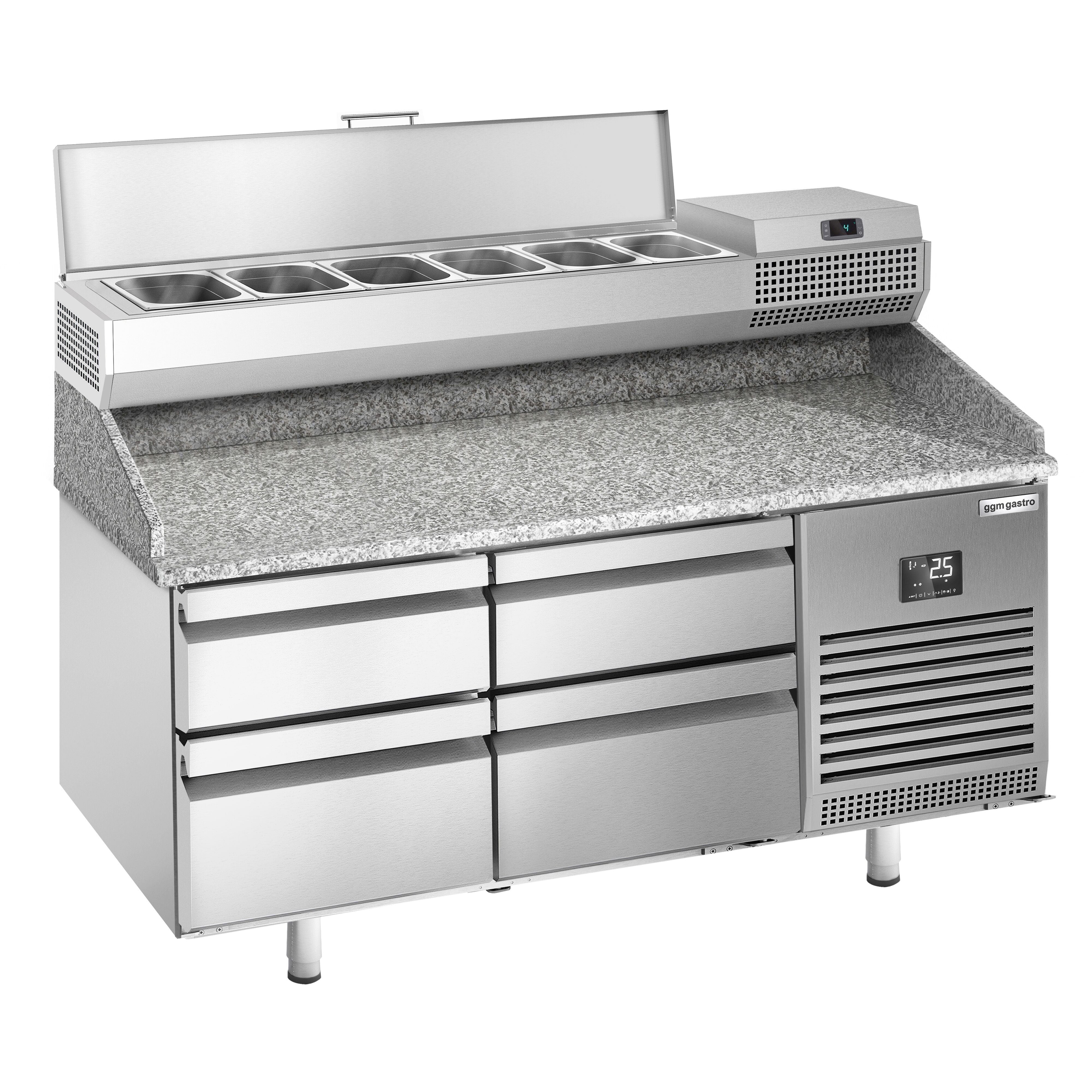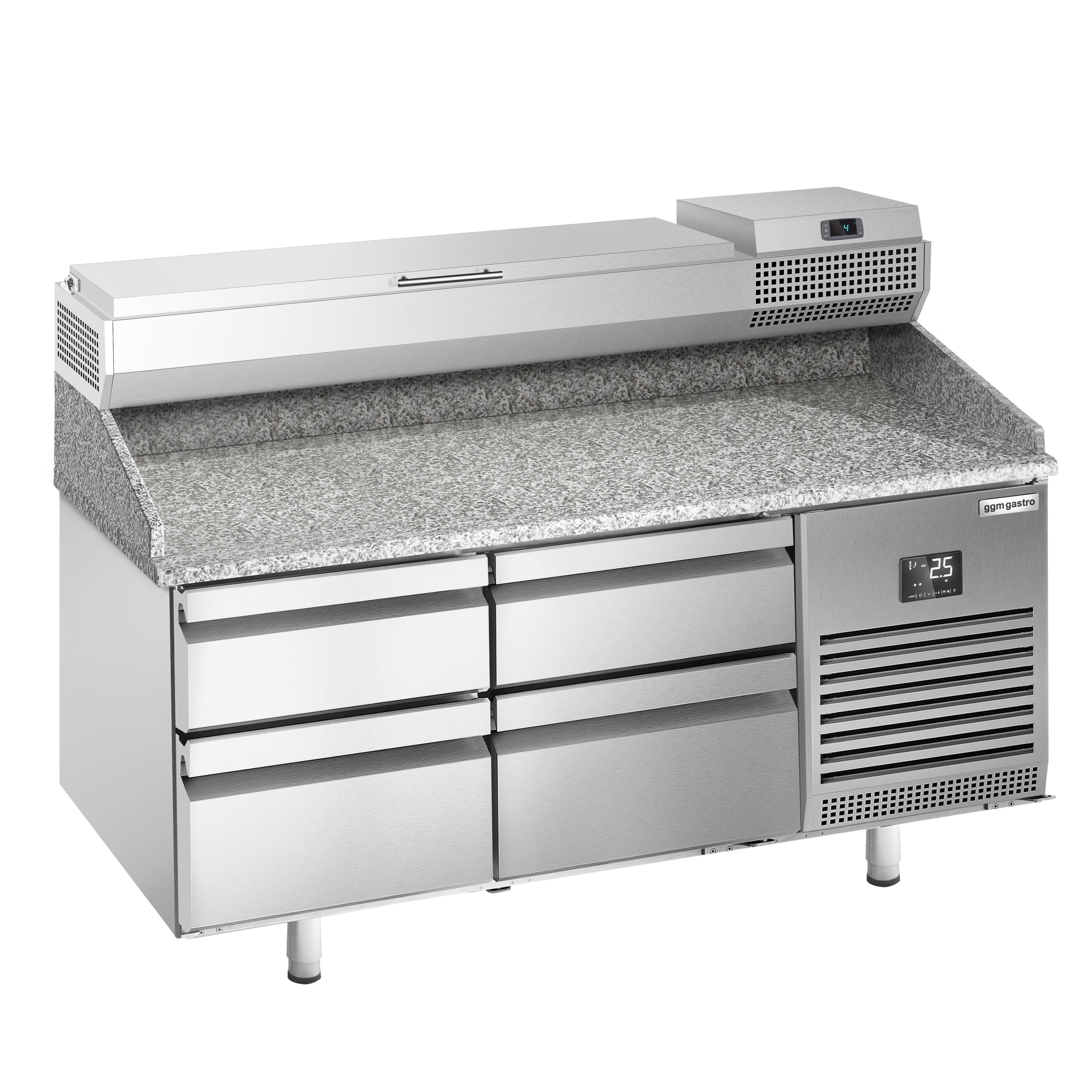 Охладителна маса за пица (GN) - с 4 чекмеджета 2x 2/3 и 2x 1/3 (GN 1/1) и охлаждаща горна витрина за 6x GN 1/4 контейнера