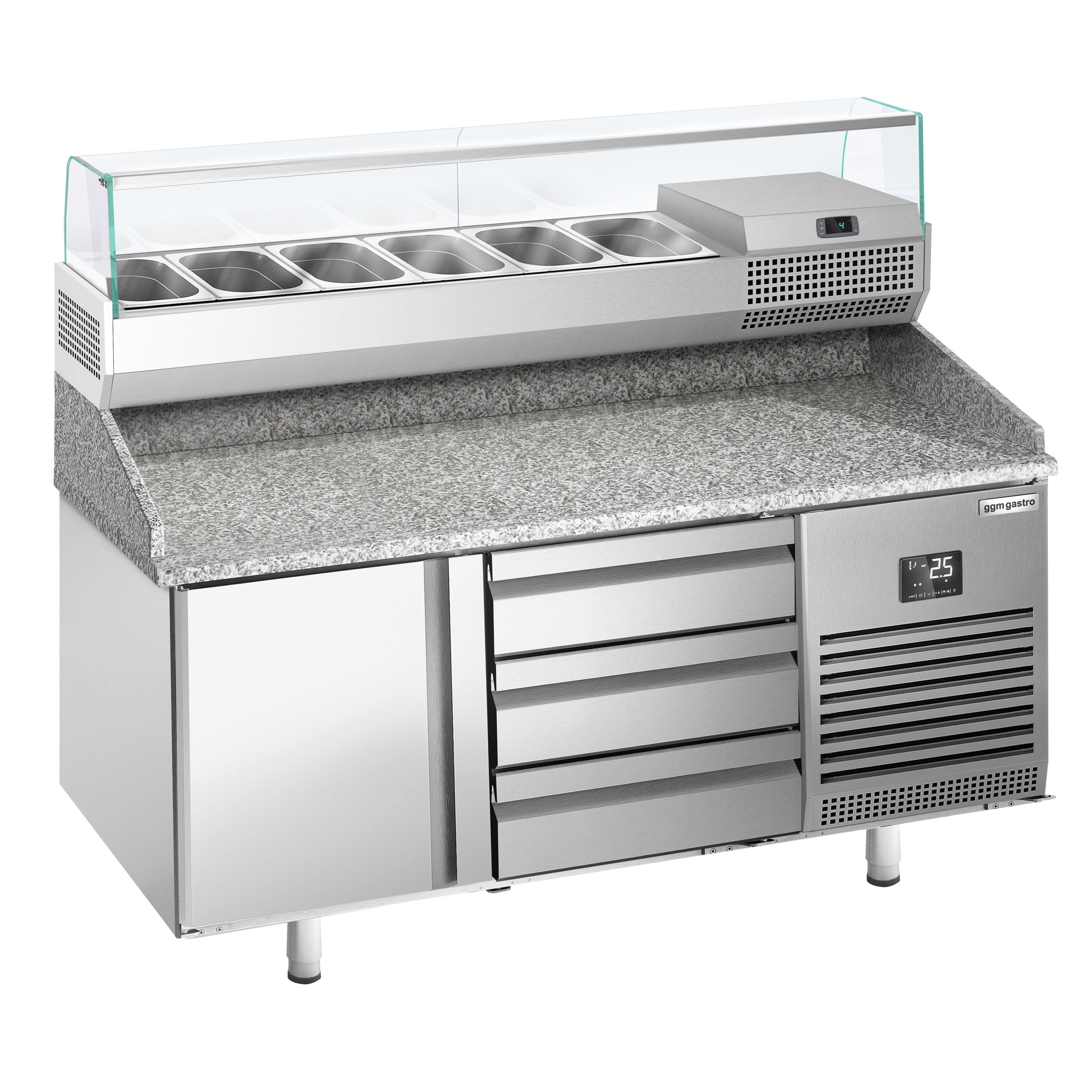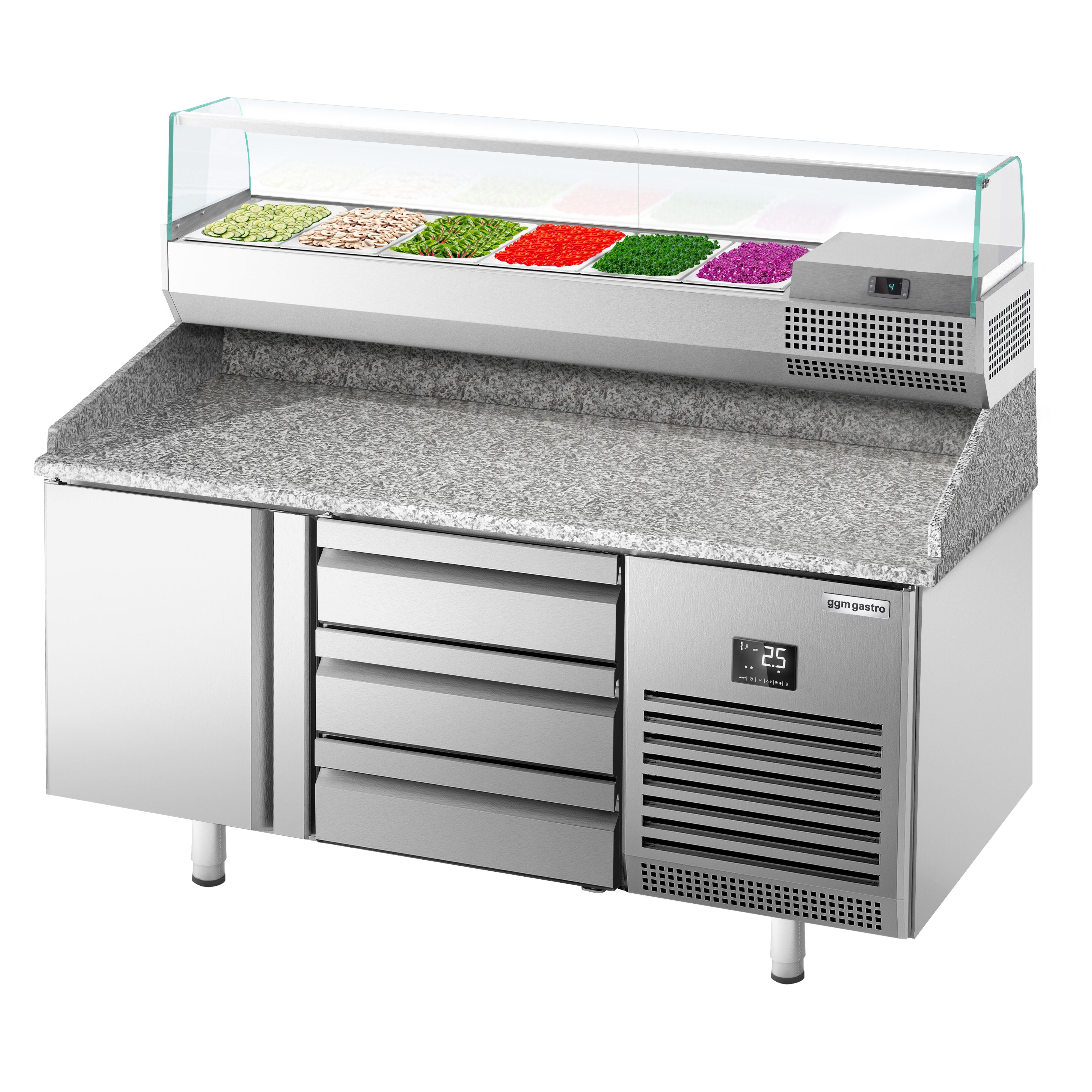 Хладилна маса за пица (GN) - с 1 врата, 3 чекмеджета 1/3 (GN 1/1) и охлаждаща горна витрина за 6x GN 1/4 контейнера