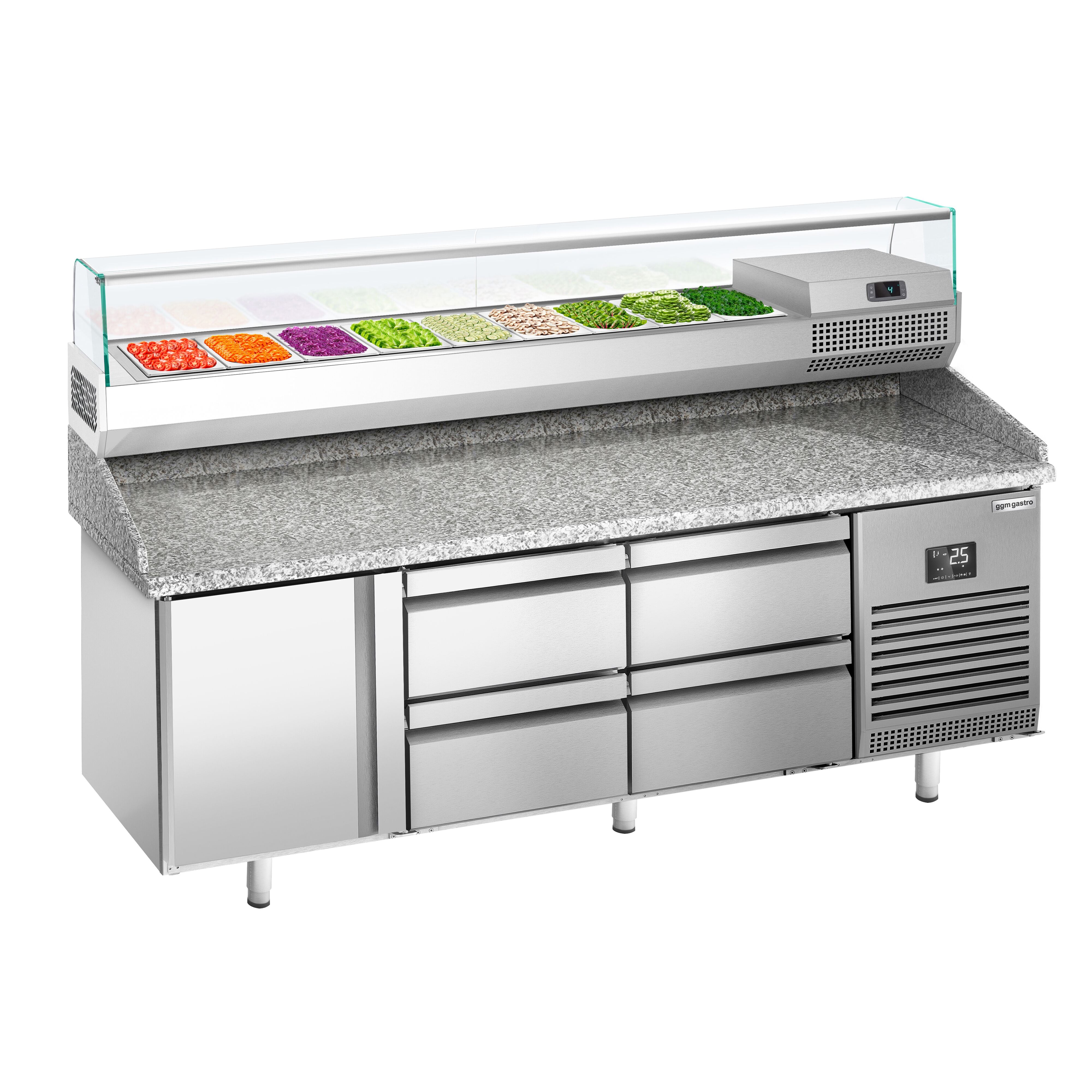Хладилна маса за пица (GN) - с 1 врата, 4 чекмеджета 1/2 (GN 1/1) и охлаждаща горна витрина за 9x GN 1/4 контейнера