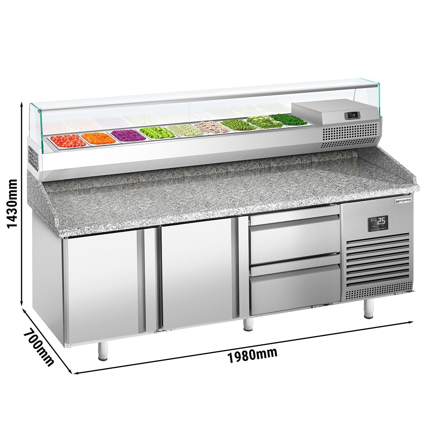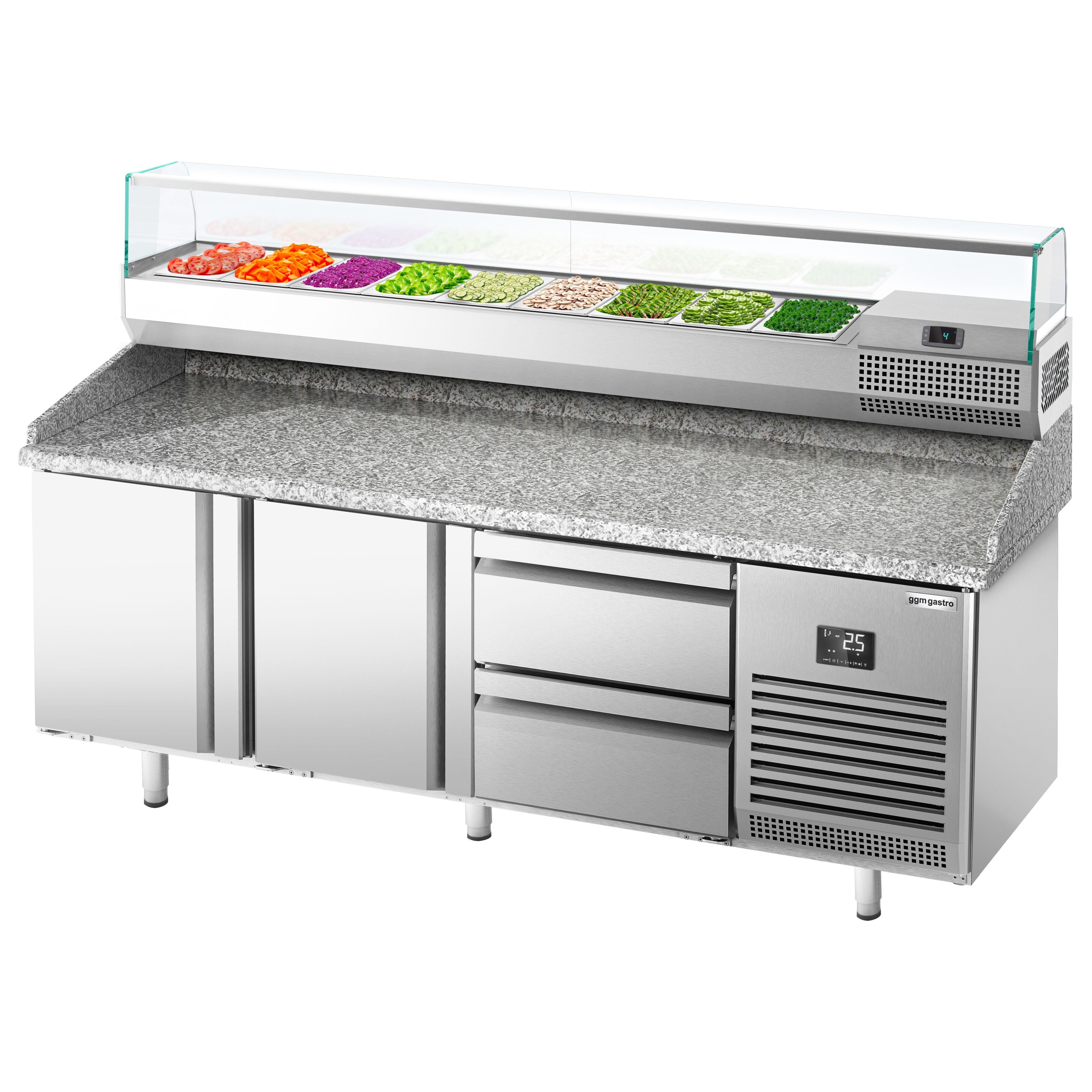 Хладилна маса за пица (GN) - с 2 врати, 2 чекмеджета 1/2 (GN 1/1) и охлаждаща горна витрина за 9x GN 1/4 контейнера