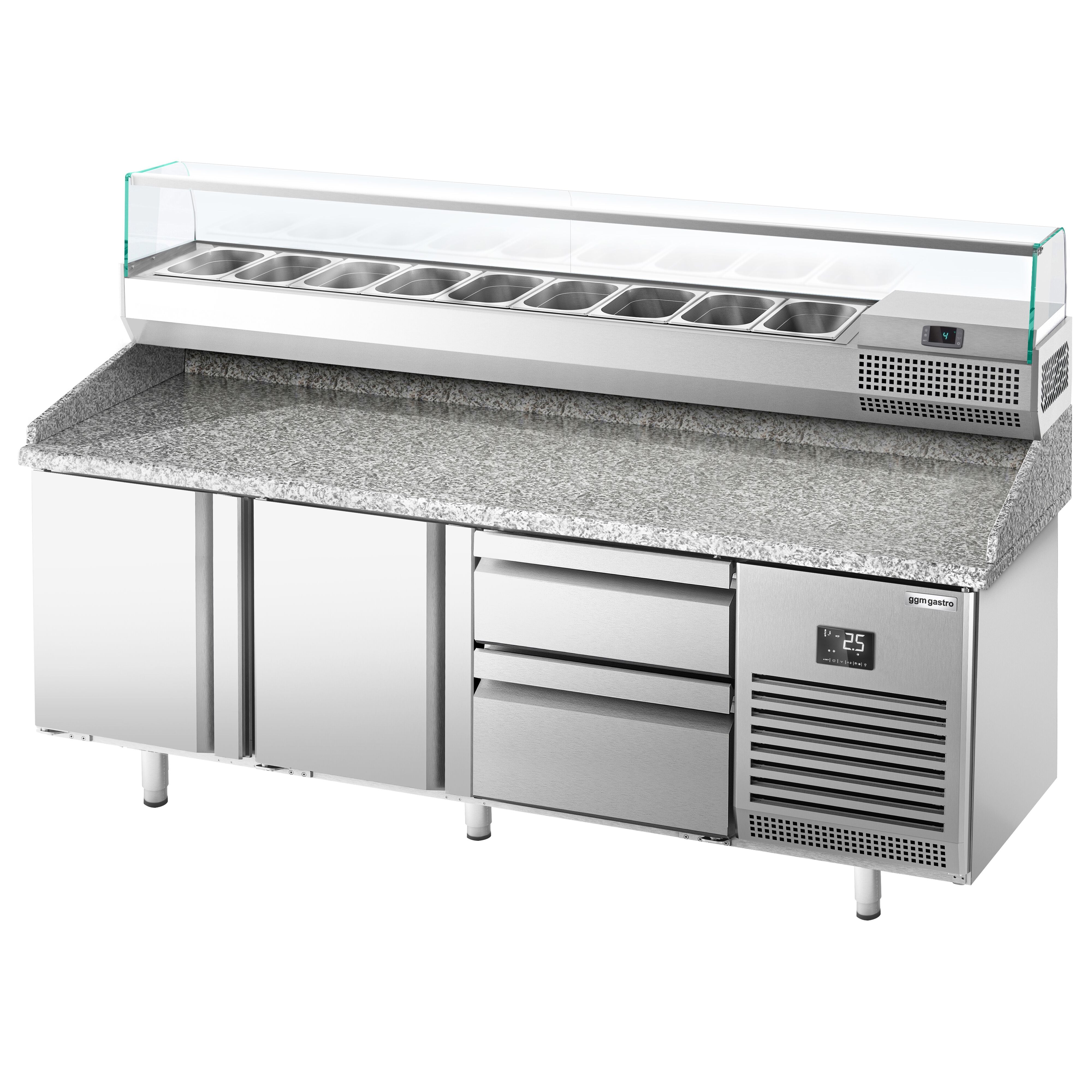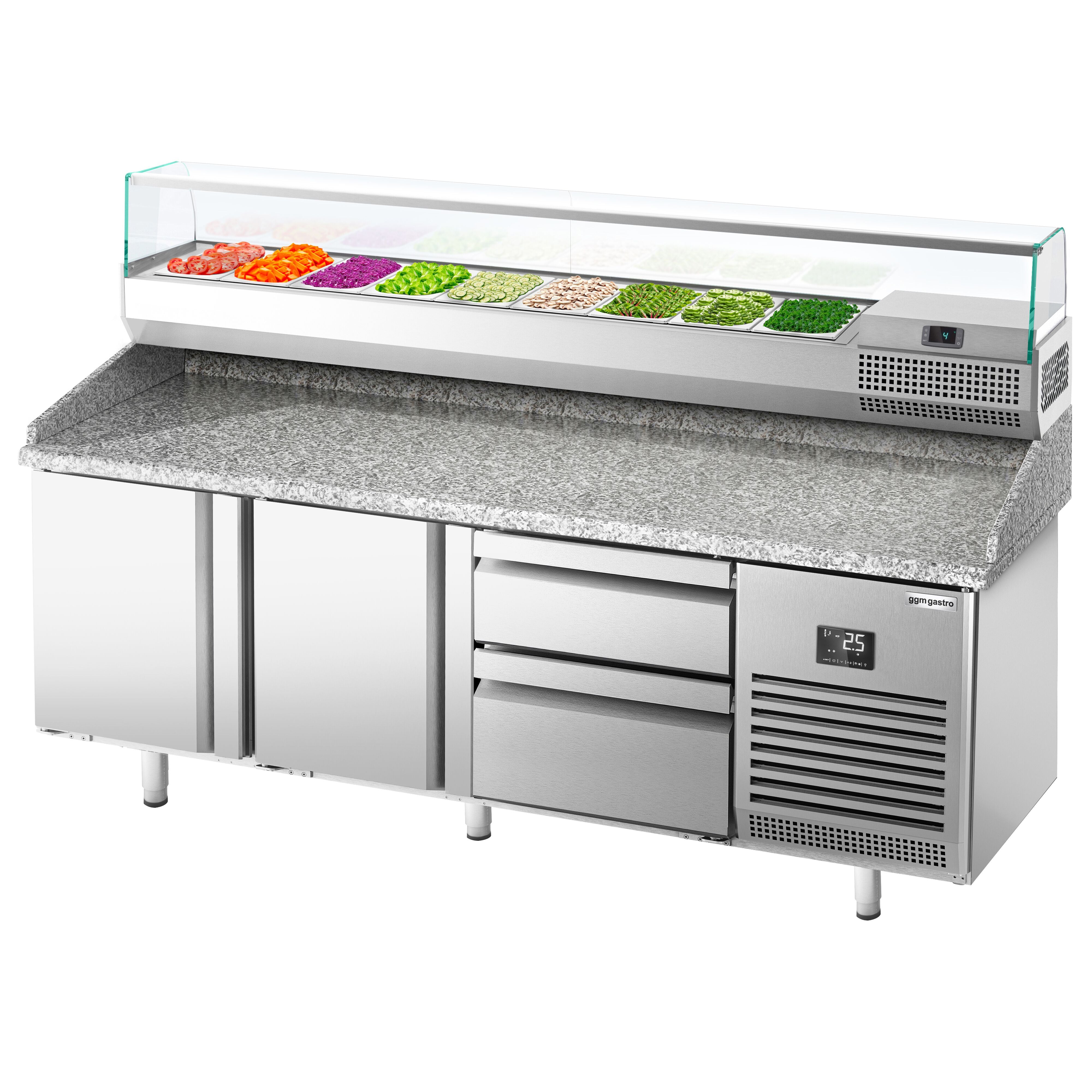Хладилна маса за пица (GN) - с 2 врати, 2 чекмеджета 1x 2/3 и 1x 1/3 (GN 1/1) и охлаждаща горна витрина за 9x GN 1/4 контейнера