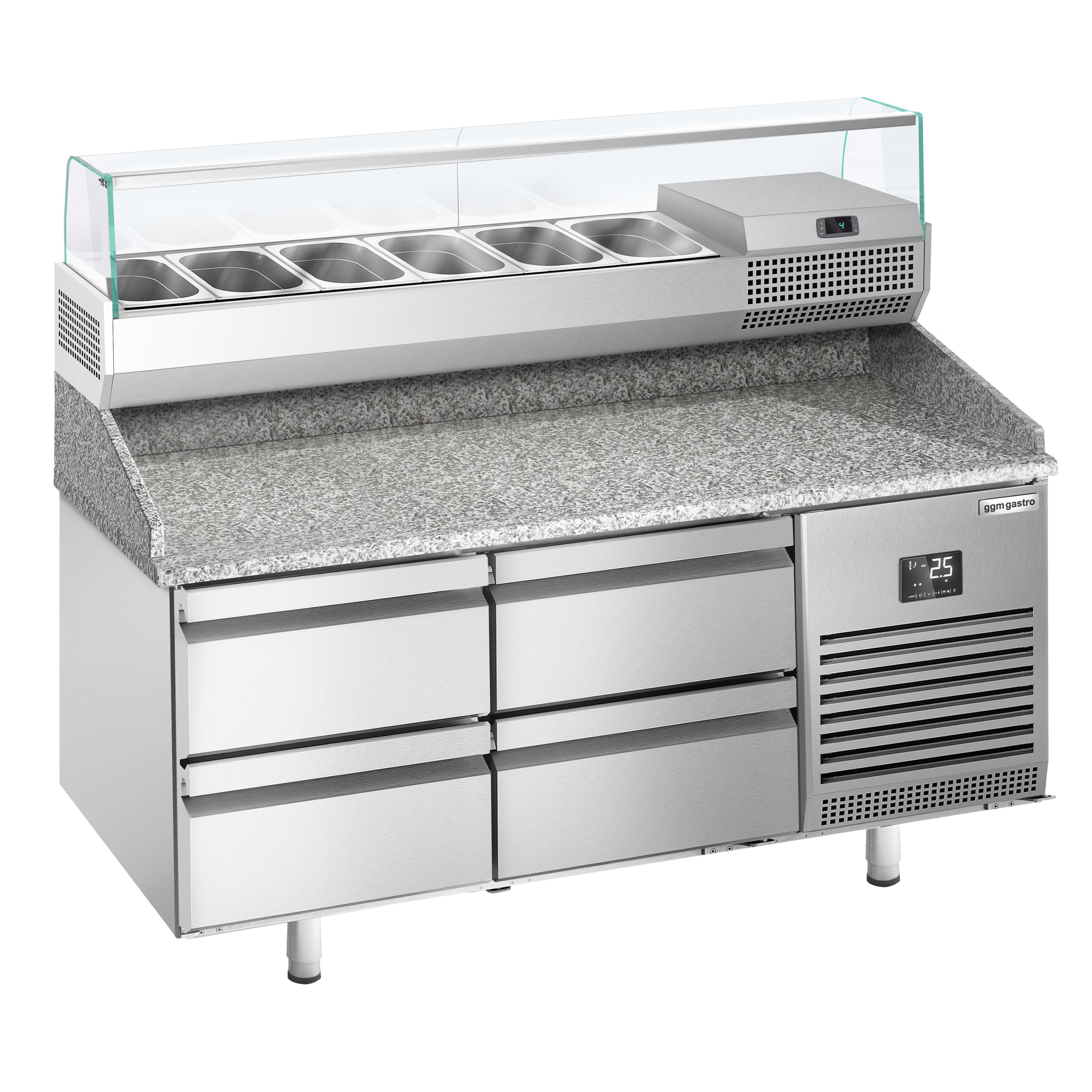 Хладилна маса за пица (GN) - с 4 чекмеджета 1/2 (GN 1/1) и охлаждаща горна витрина за 6x GN 1/4 контейнера