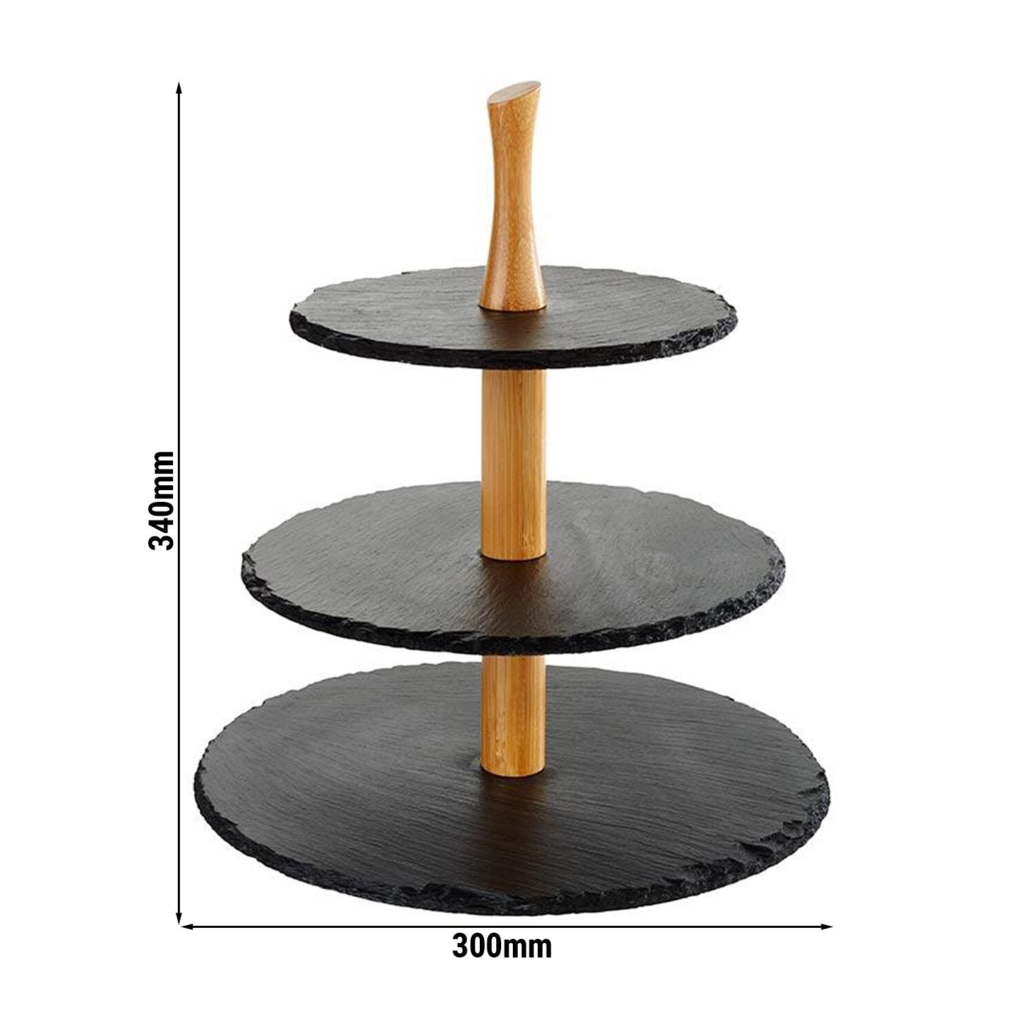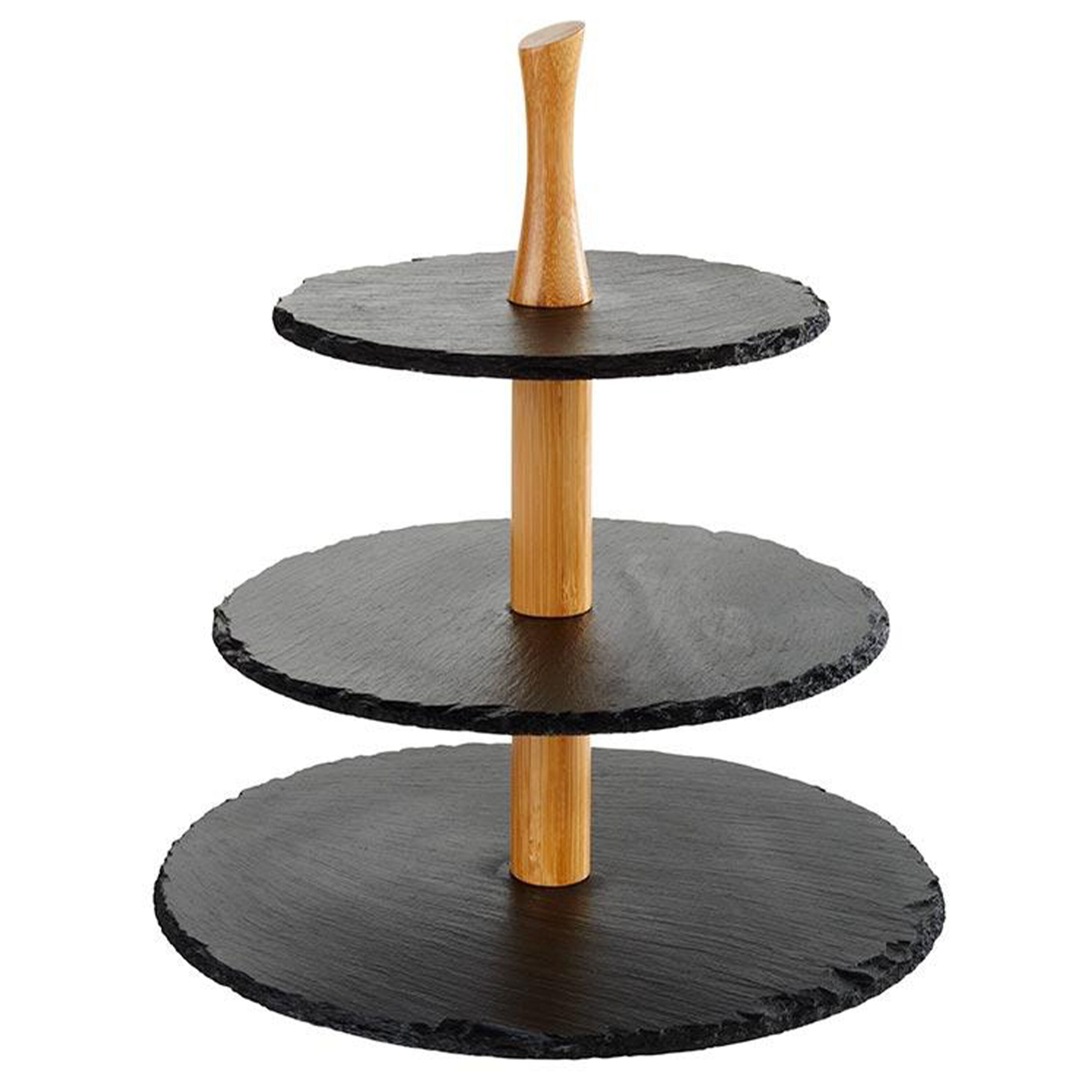 Етажерка - 3-етажна - Кръгла - Дървена рамка - Рафтове от шисти
