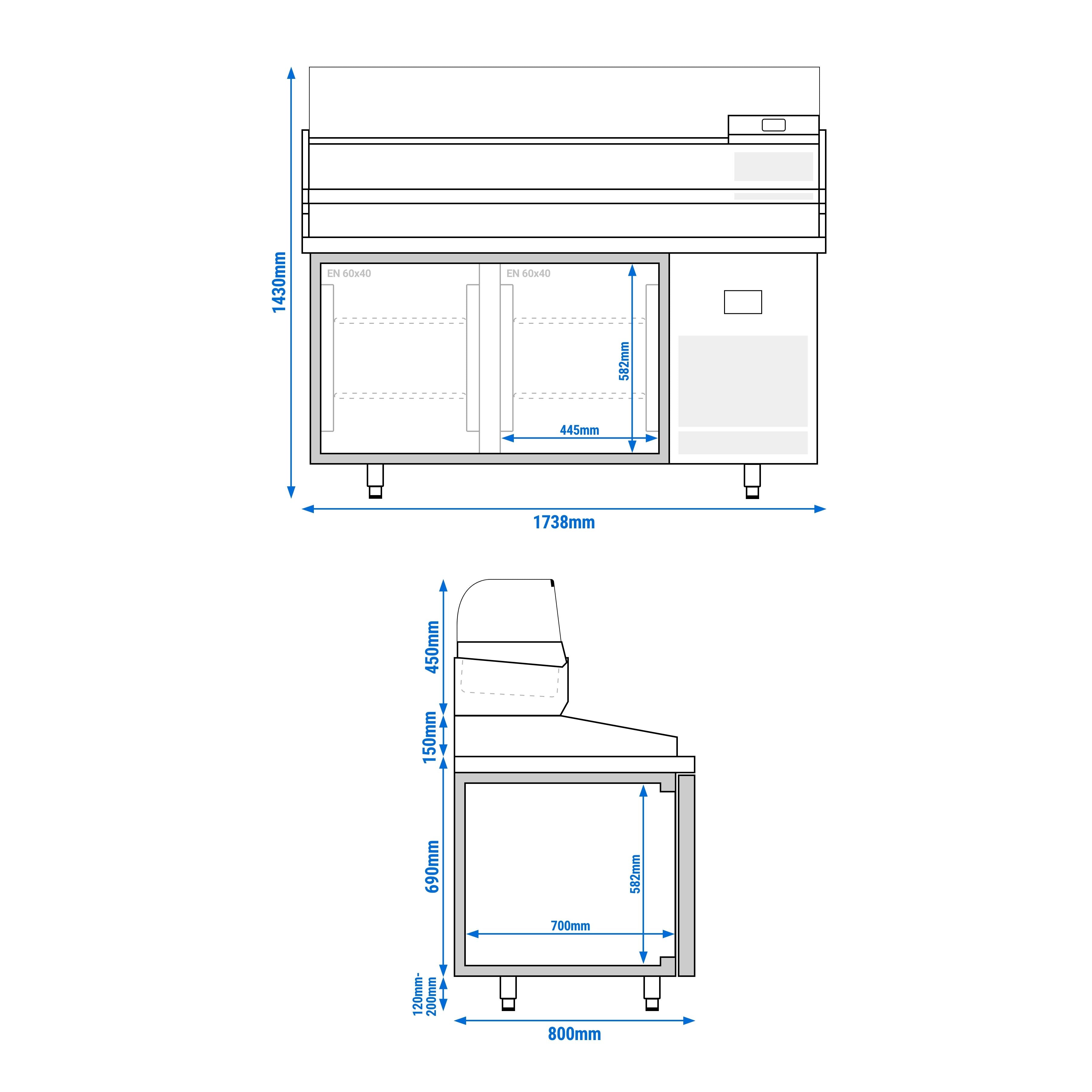 - Витрина, монтирана отгоре: например 6 x GN 1/3 Контейнер, GN 1/2, GN 1/4 също е възможно