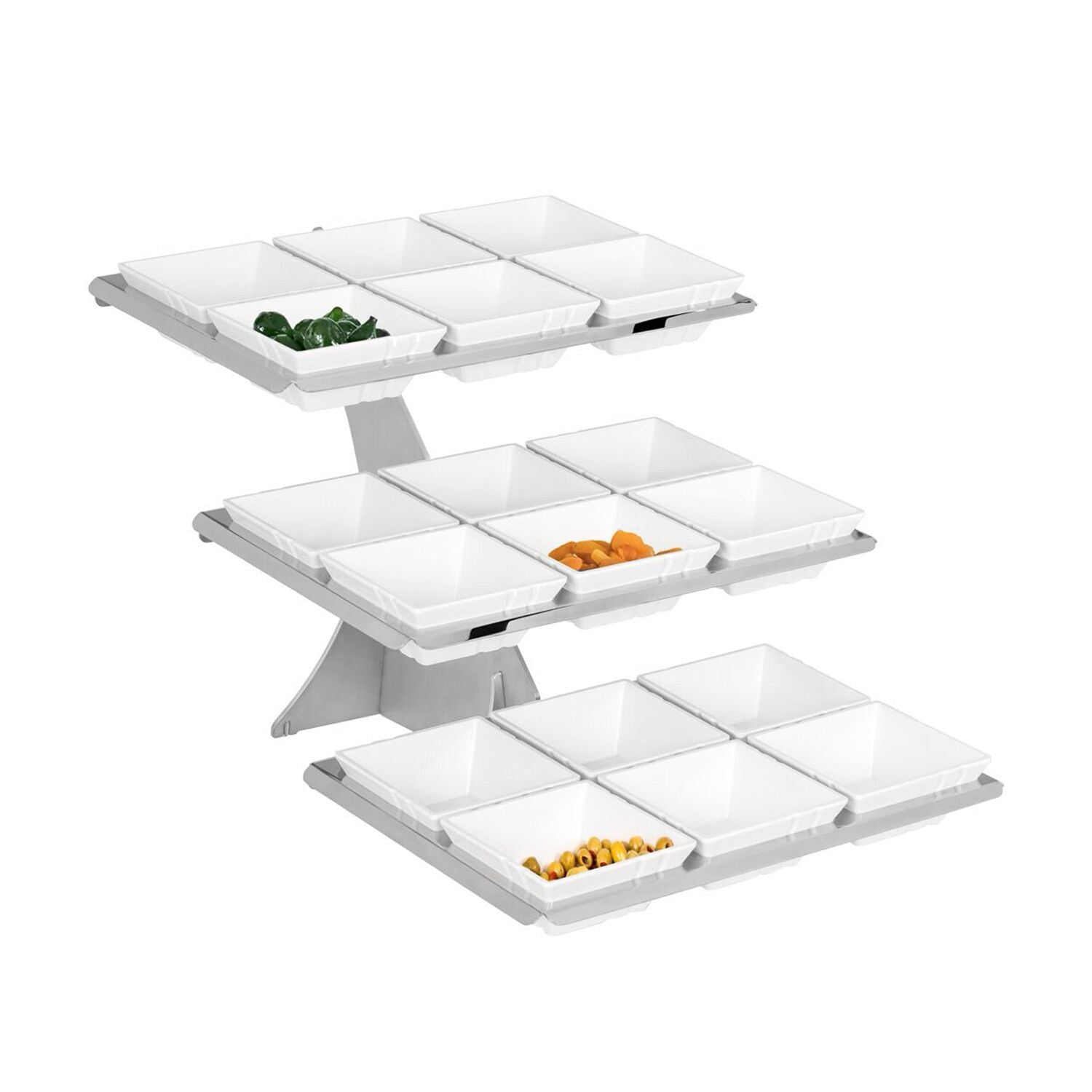 Стойка за бюфет - инокс и меламинова - хром - правоъгълна - Височина:412mm - вкл. 18 меламинови купи 140x140mm - с 3 нива