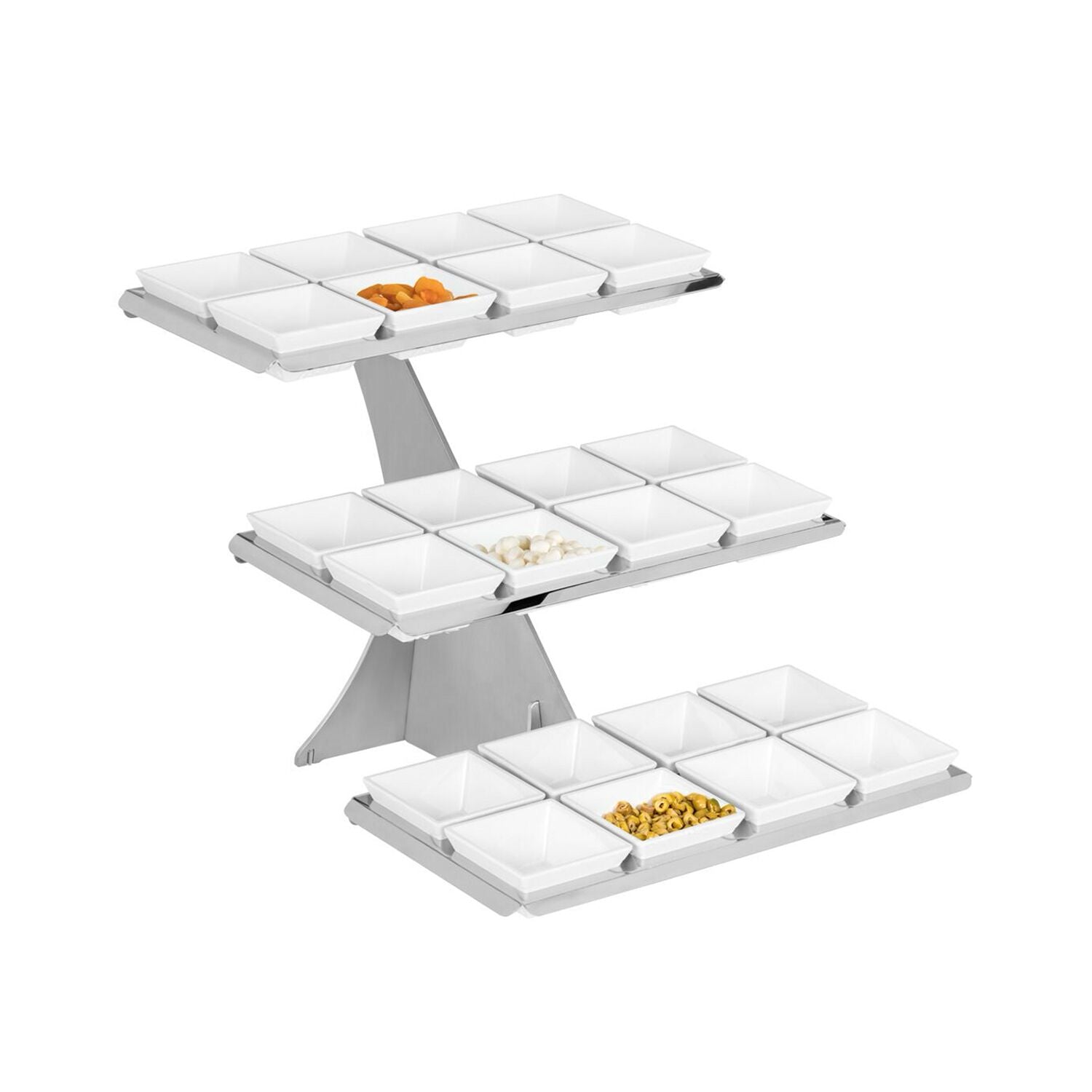 Стойка за бюфет - инокс и меламинова - хром - правоъгълна - Височина:420mm - вкл. 24 меламинови купички 100x100mm - с 3 нива
