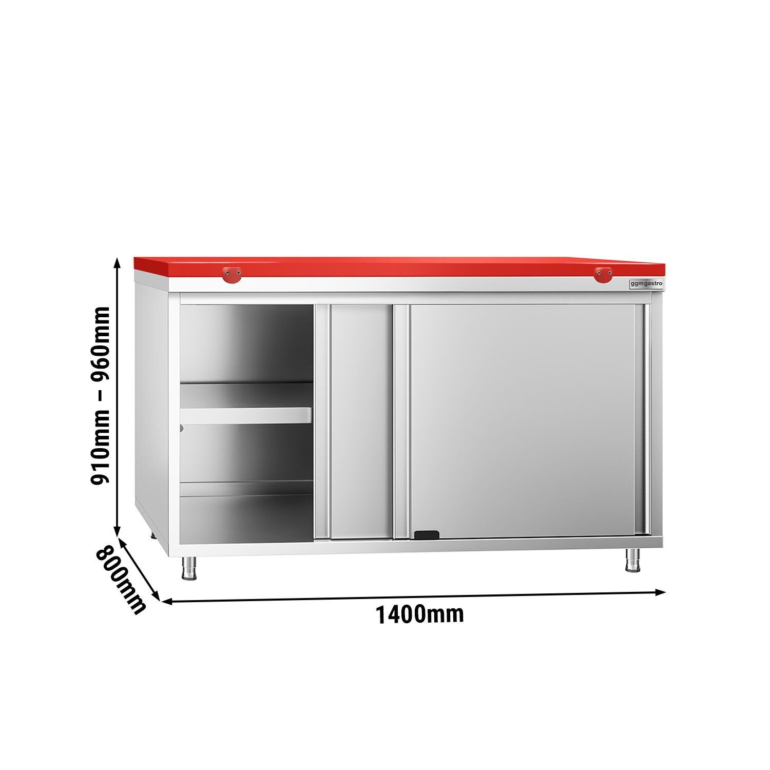 Работен шкаф от неръждаема стомана - 1,4 м - с плъзгаща се врата - включително дъска за рязане в червено