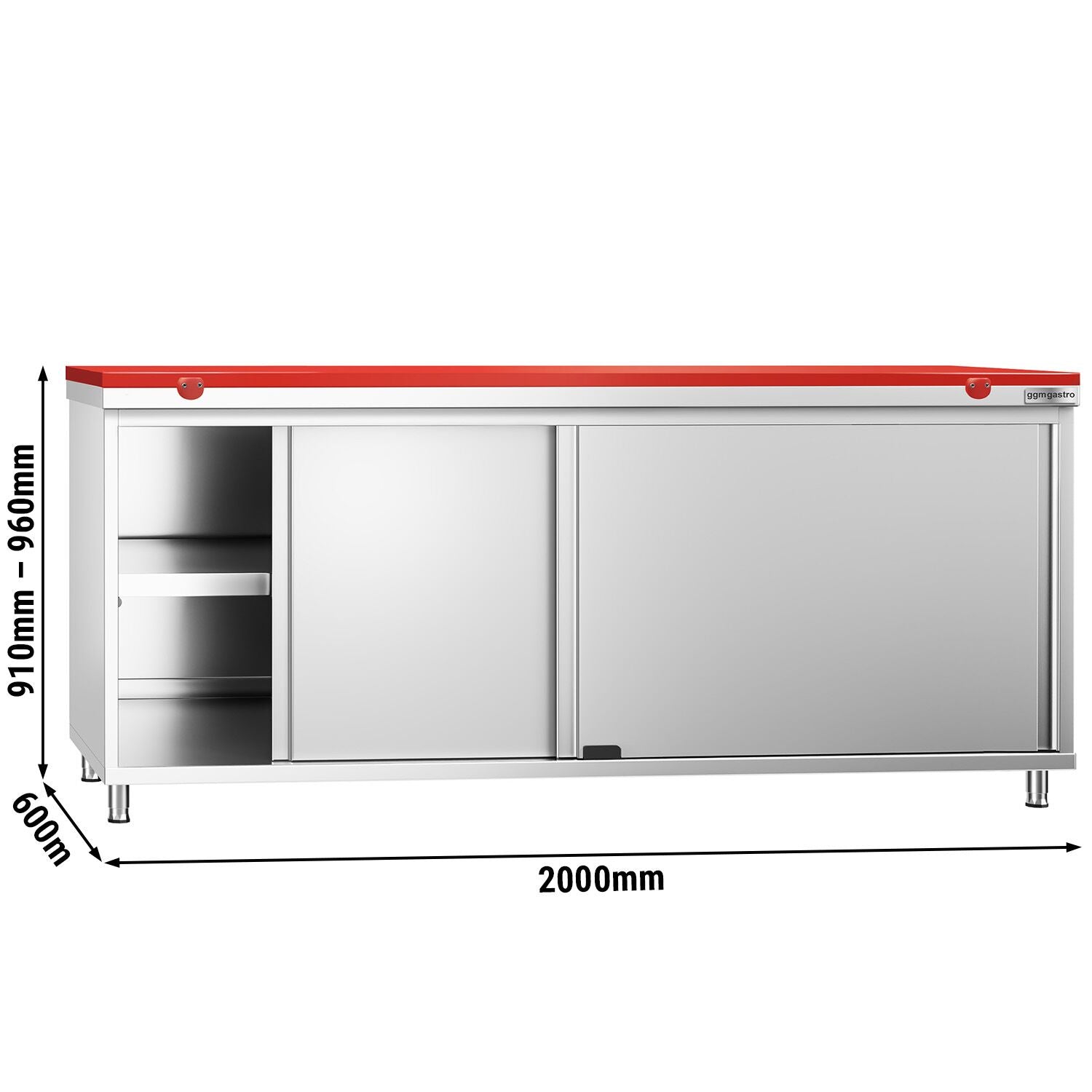 Работен шкаф от неръждаема стомана PREMIUM - 2,0 м - с плъзгаща се врата - вкл. дъска за рязане в червено