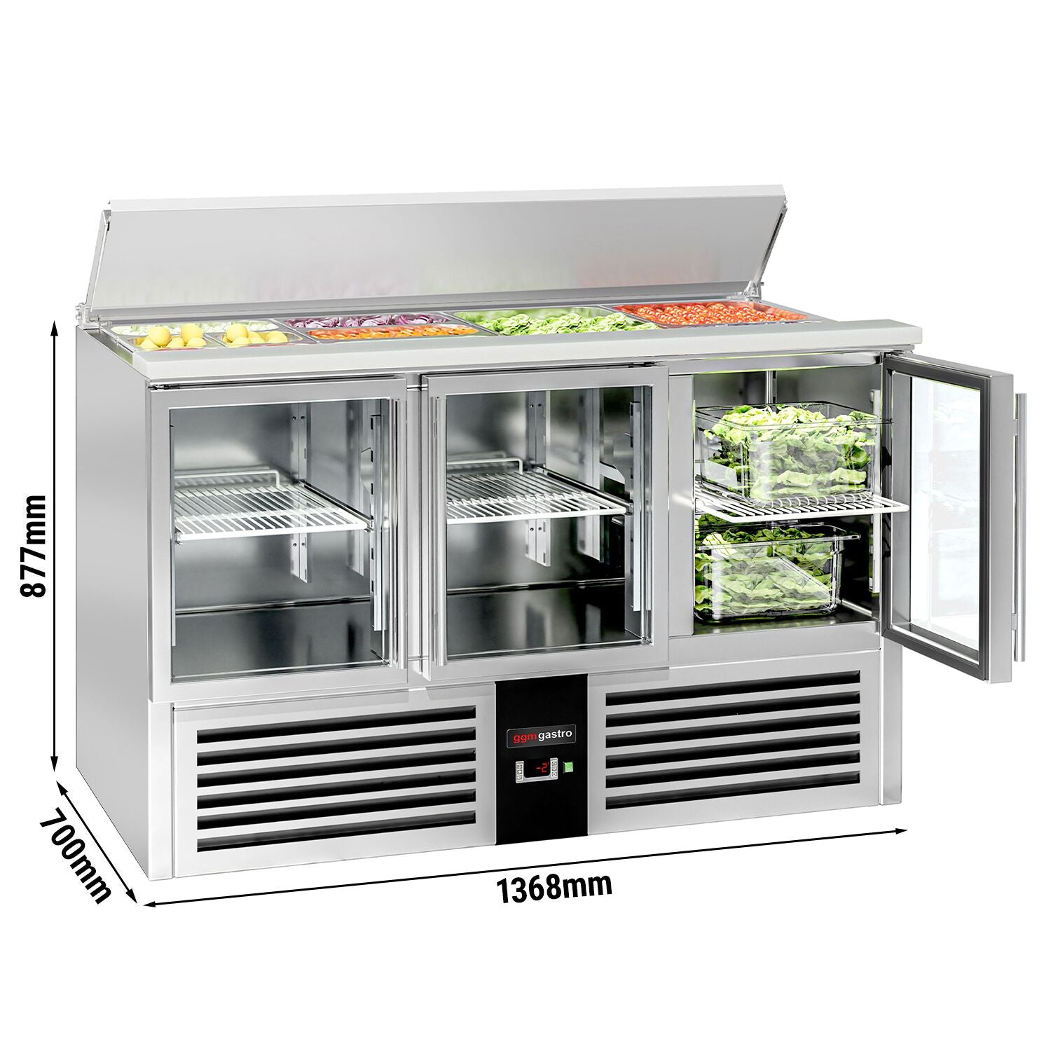 Салатиера PREMIUM - 1370 мм - 3 стъклени врати - с вход за 4x GN 1/1 и капак от неръждаема стомана
