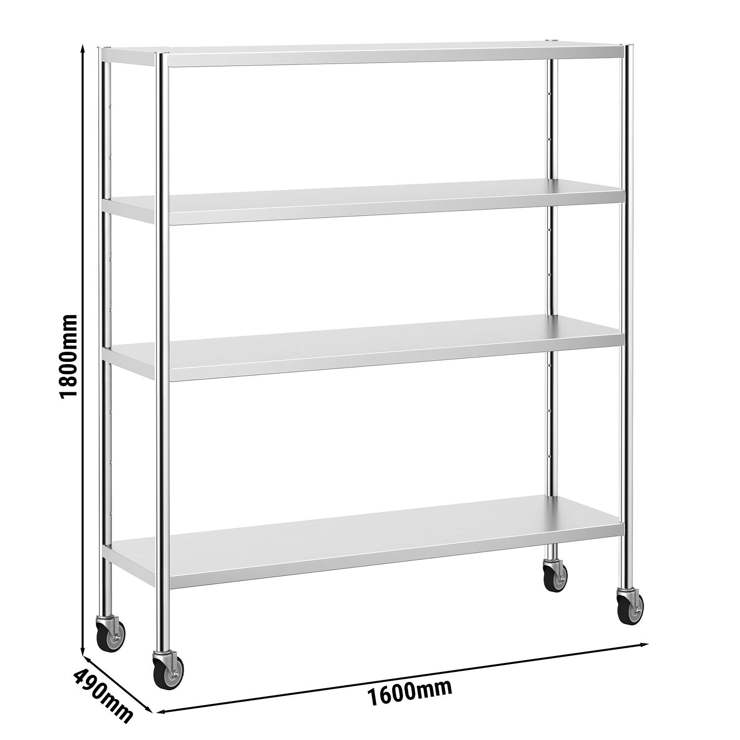 Стелаж от неръждаема стомана - 1.6 х 0.5 с 4 регулируеми рафта, с включени 4 колелца